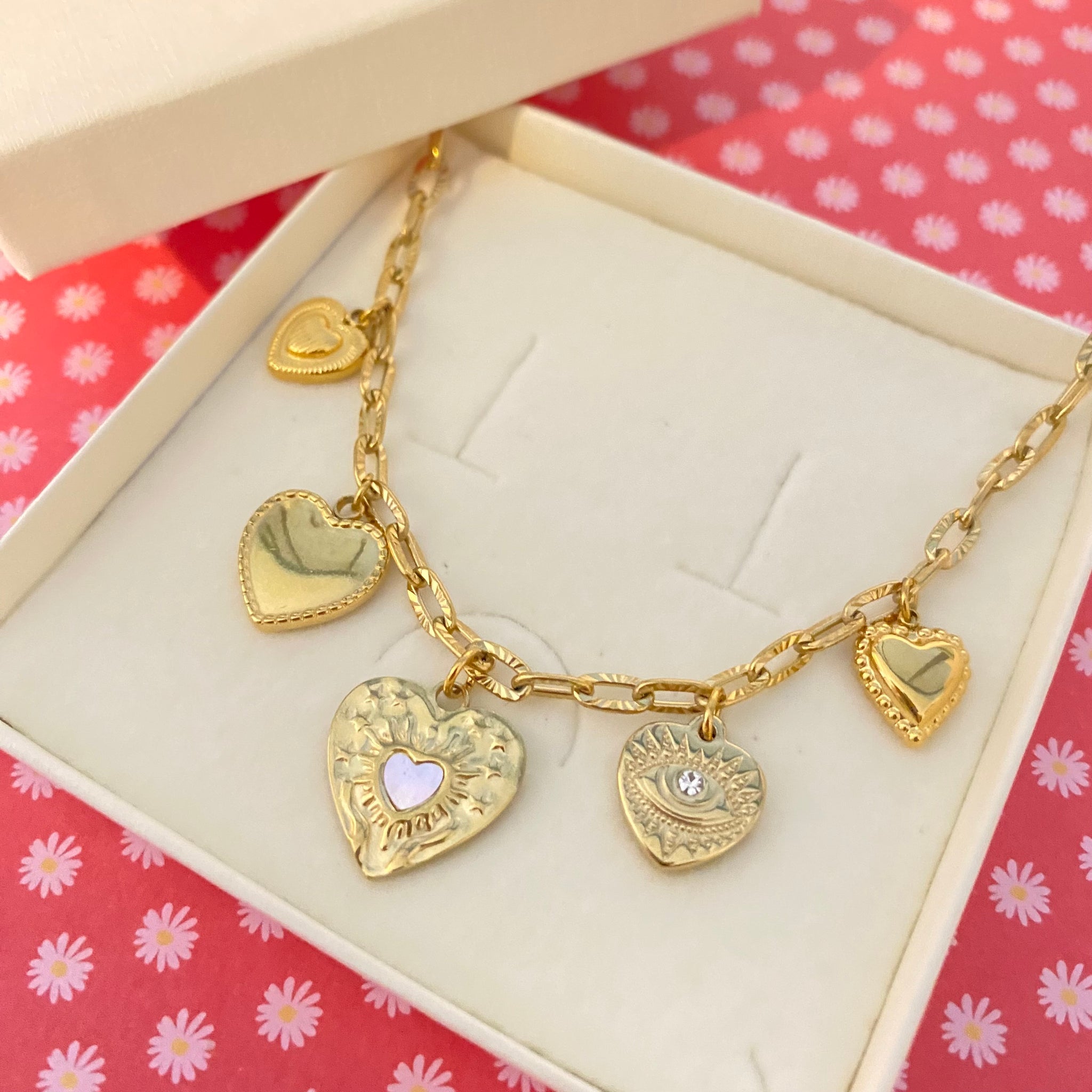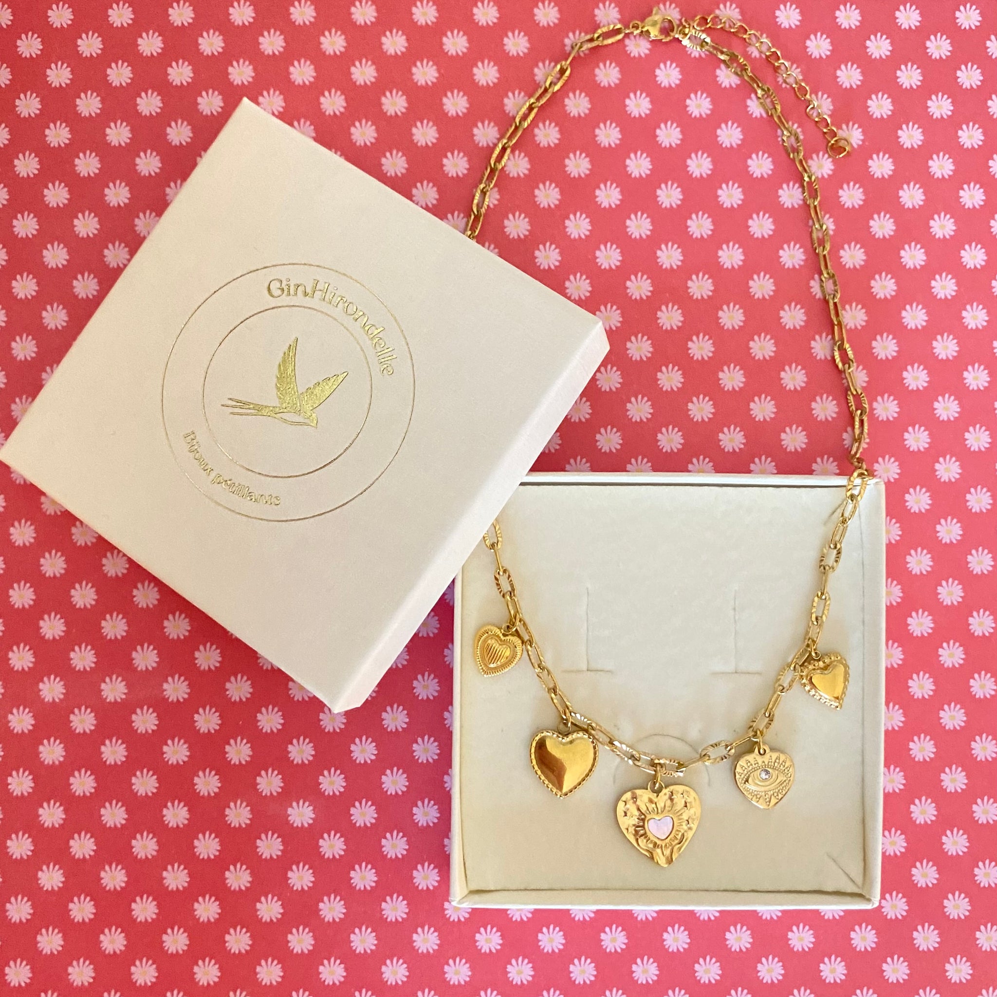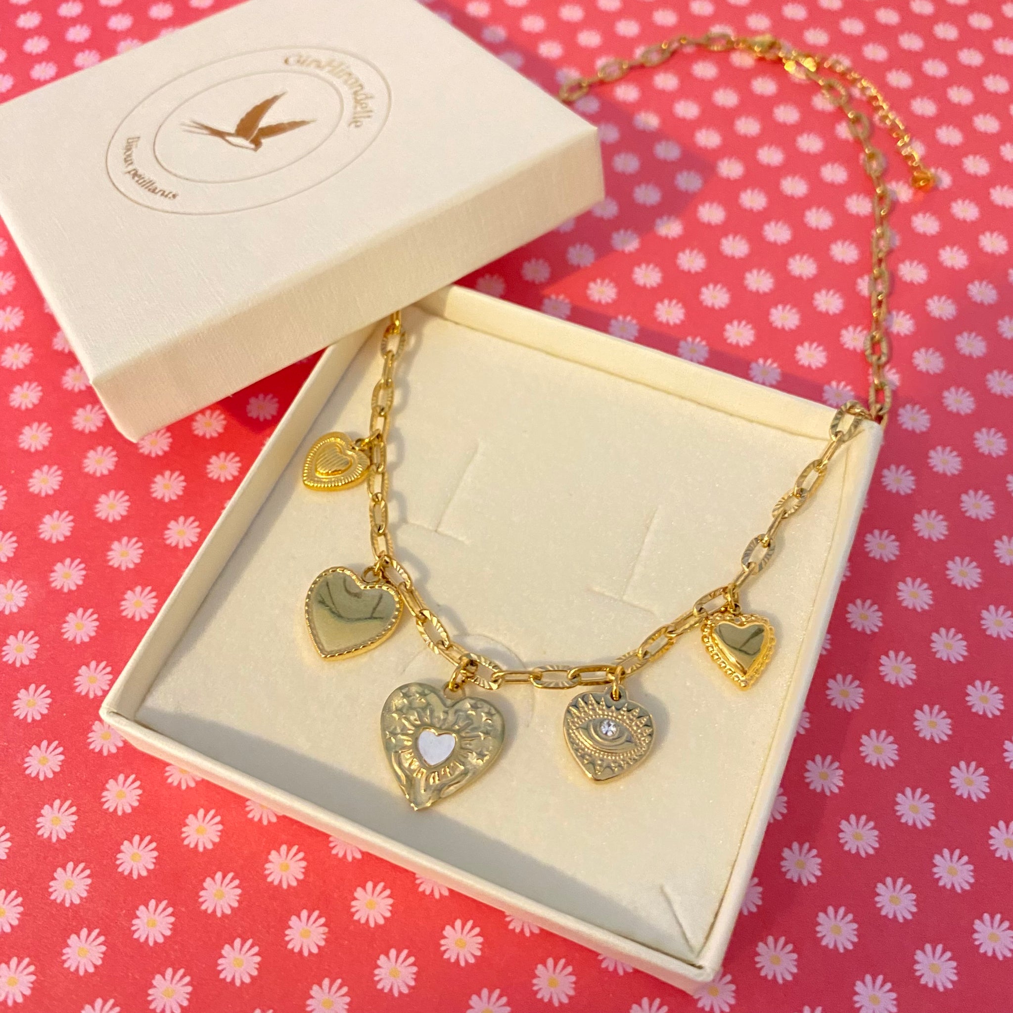 Collier Ita coeurs et oeil protecteur acier inox doré