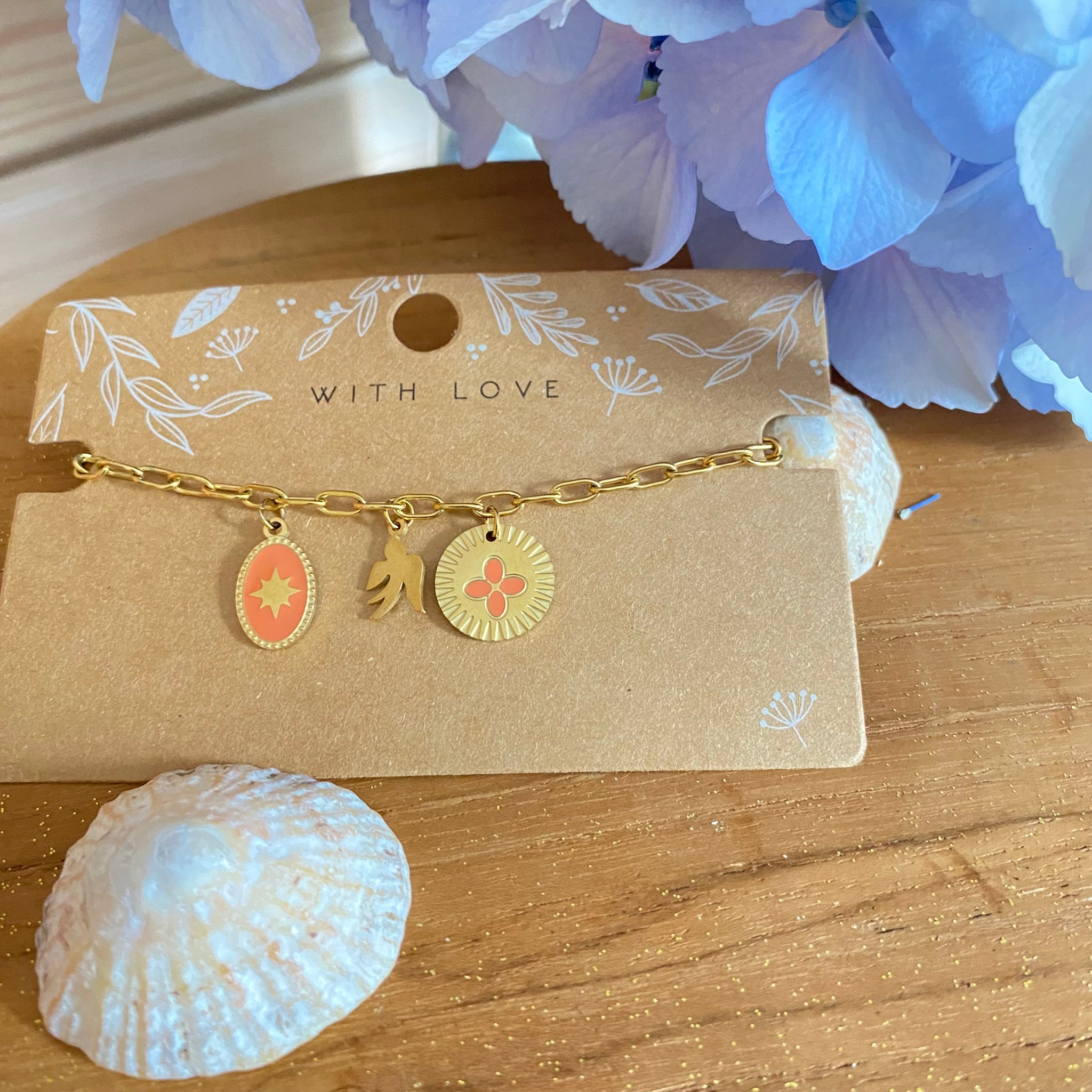 - Pendentifs ovale (étoile) et rond (fleur) émaillés en acier inox doré